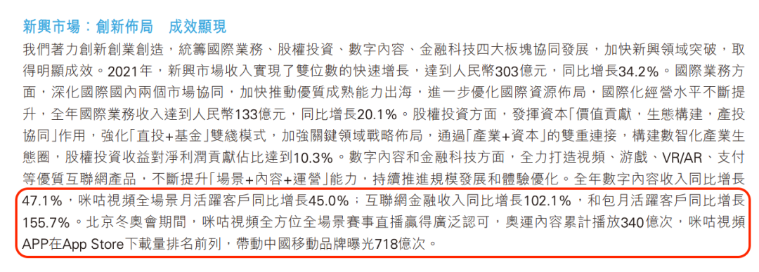 時至今日,咪咕視頻在中國移動2021年財報中僅體現為,在北京冬奧會期間帶動中國移動品牌曝光718億次。現在咪咕視頻最大問題依然還是沒有足夠的內容能夠持續吸引用户高頻使用,即便很多時候這一平臺已經不需要額外付費。