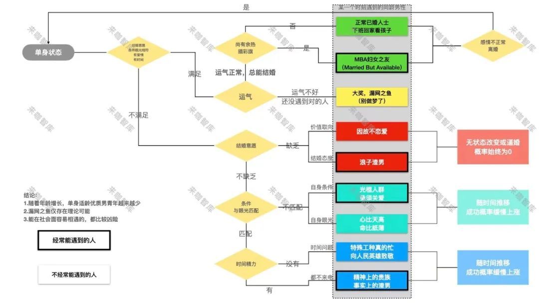 通過下圖對一個女生在某一時刻可以遇到的所有異性,都進行了分類,我們可以看到,事實上真正的可選適婚男性很少。同時,隨着女方年齡的增長,遇到同齡單身適合結婚的概率會越來越低。