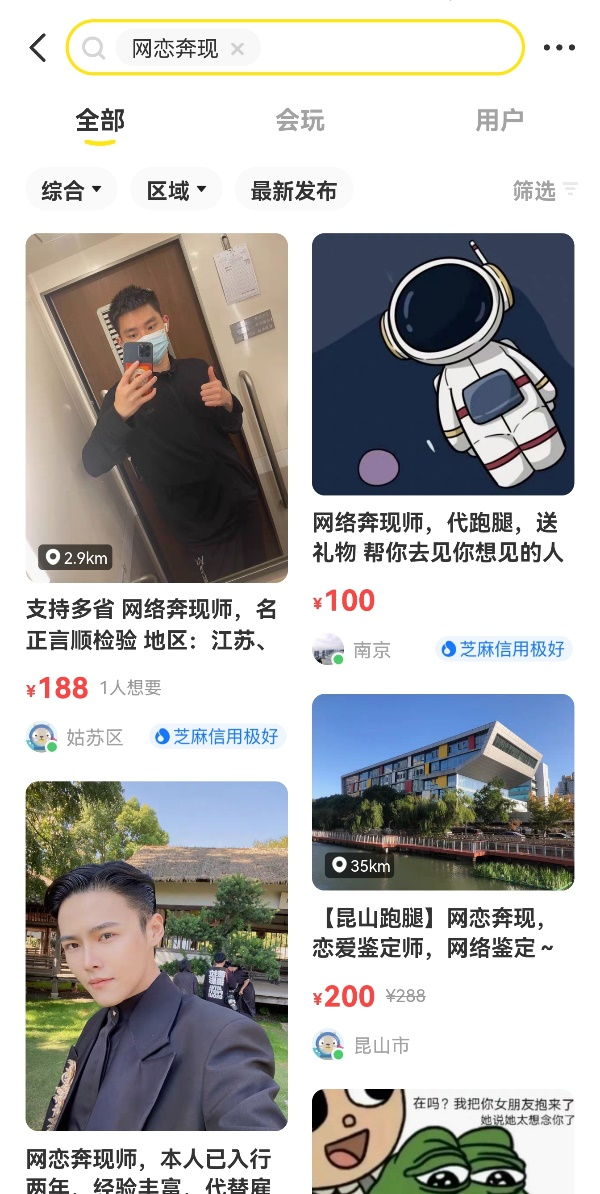 在閒魚上更是應運而生一種新的服務:網絡奔現師。只要在閒魚中搜索關鍵詞網絡奔現,就會搜索出相應的內容,主要提供網戀對象現場錄製視頻(考察顏值),代送禮物、甚至性別鑑定(以防萌妹變摳腳大漢)。網絡奔現師的出現,是爲了維持人們對網戀美好的幻想,以及避免各類翻車難受事件的出現,因此受到了一些年輕人的推崇。