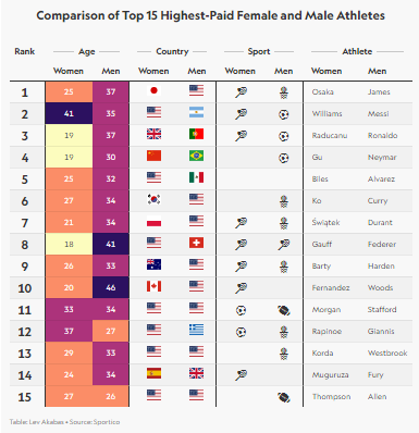 與男運動員收入榜單橫向比對發現,2022年收入最高的三名女運動員都是網球運動員,而四名收入最高的男運動員中有三名是足球運動員;收入最高的15名女運動員平均年齡為25歲,收入最高的男運動員平均年齡為34歲。