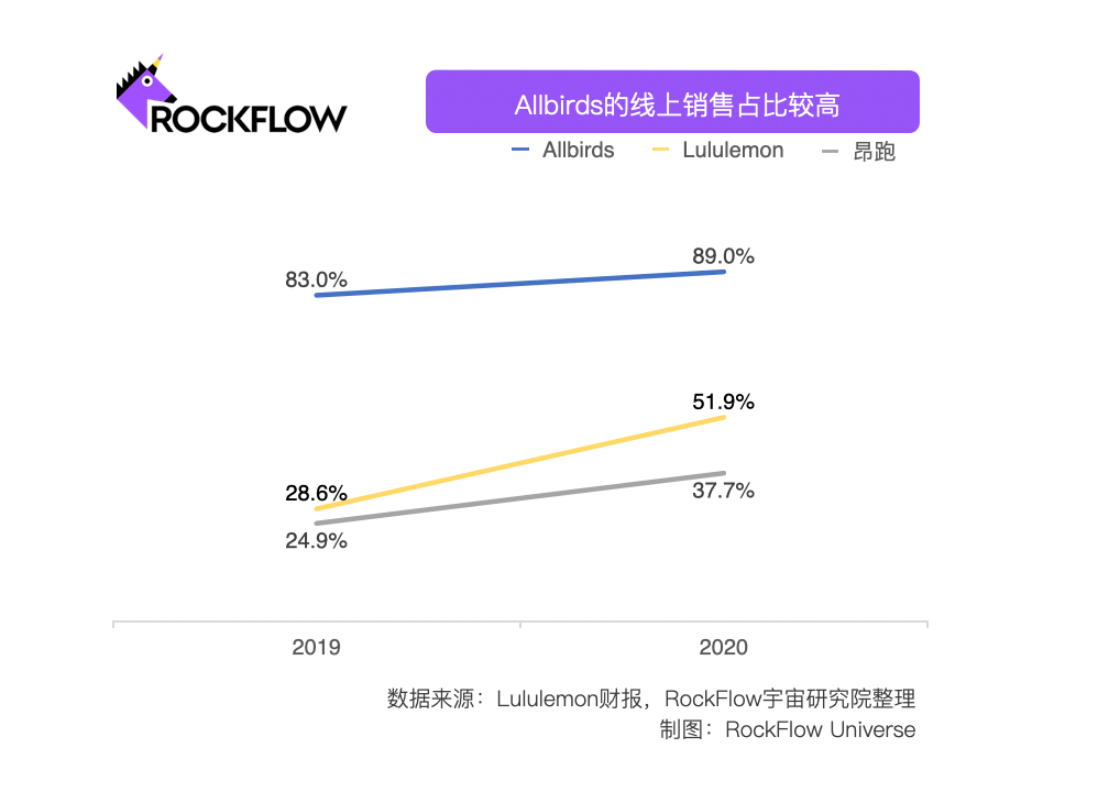 同類型中,Allbirds 仍然算是較為激進的DTC 玩家,不僅完全採用 DTC 進行銷售,還高度依賴線上渠道,目前只有31家線下直營店。2020年,Allbirds的線上渠道佔銷售總額的89%,比Lululemon 的51.9%和昂跑的 37.7% 要高很多。