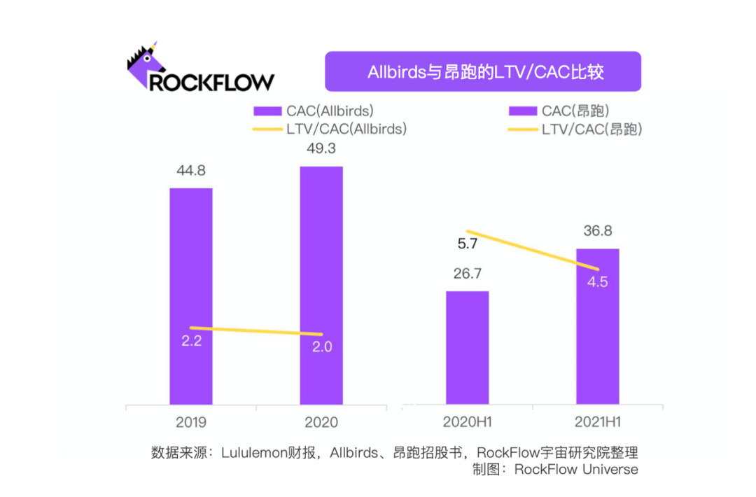在獲客效率上,Allbirds 的LTV / CAC數據在2020年僅為2.0,遠低於昂跑同期的5.7。
