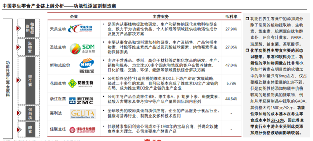 但不同的添加劑,上游供應鏈的生產製造類企業擁有的毛利水平也比較分化,如專注植物提取物的天美生物和生物素的生達生物,毛利率水平僅有27%左右,但專注維生物的新和成股份、浙江醫藥的毛利水平可達45%以上,可見,不同的添加劑在面對下游品牌商時具有不同的技術壁壘和議價水平。