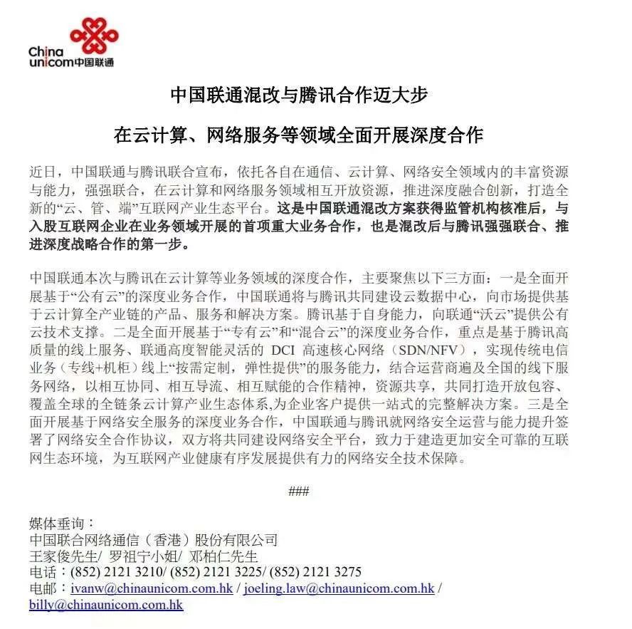 這份通告稱,中國聯通與騰訊聯合宣佈,依託各自在通信、雲計算、網絡安全領域內的豐富資源與能力,強強聯合,在雲計算和網絡服務領域相互開放資源,推進深度融合創新,打造全新的「雲、管、端」互聯網產業生態平臺。這是中國聯通混改方案獲得監管機構覈准后,與入股互聯網企業在業務領域開展的首項重大業務合作,也是混改后與騰訊強強聯合、推進深度戰略合作的第一步。