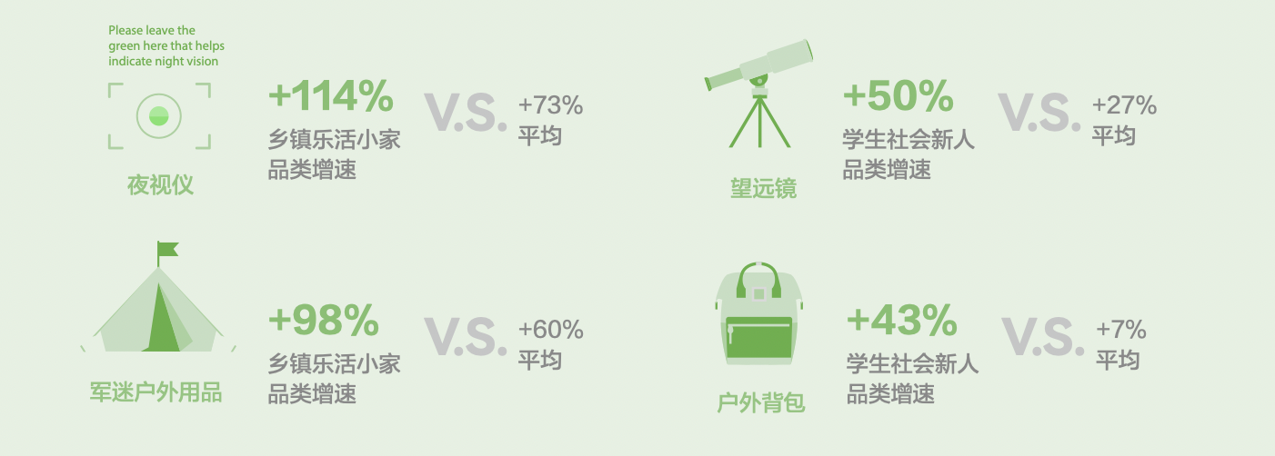這種認知上的模糊,反而促生了健康、健身、户外等場景的發展。京東PLUS會員消費數據顯示,營養保健品類增速達 50%,其中,維生素、礦物質、養顏抗氧化、增強免疫等產品增速突出;疫情之下,野餐、露營燈户外野趣不斷興起,野餐用品增速就高達53%。