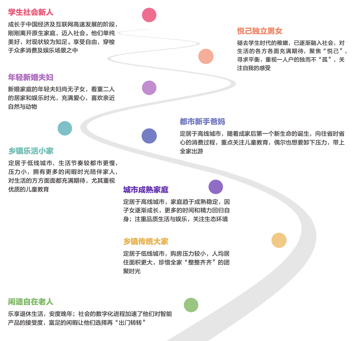 他們分別是(1)學生社會新人;(2)悦己獨立男女;(3)年輕新婚夫婦;(4)都市新手爸媽;(5)城市成熟家庭;(6)鄉鎮樂活小家;(7)鄉鎮傳統大家;(8)閒適自在老人