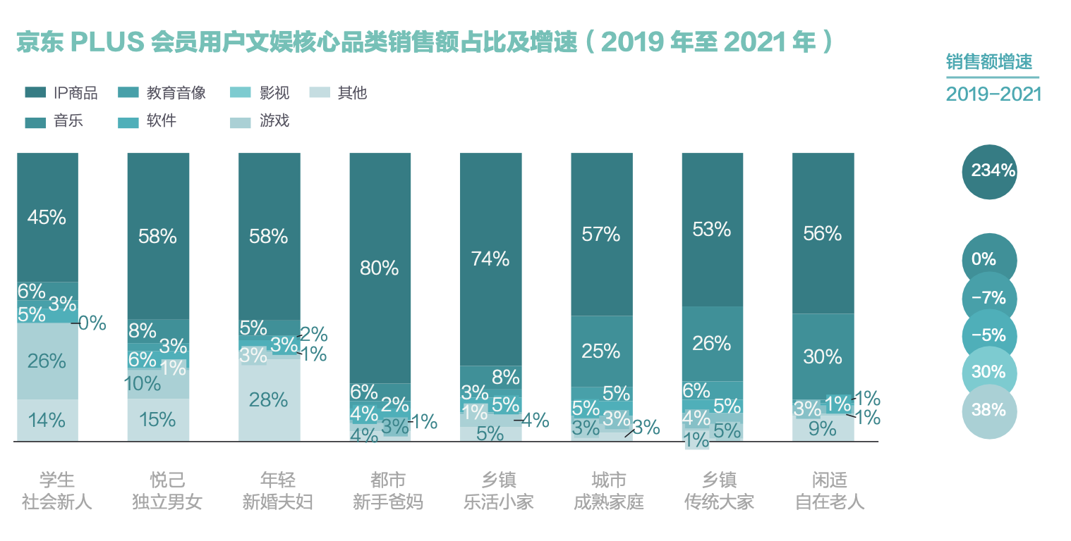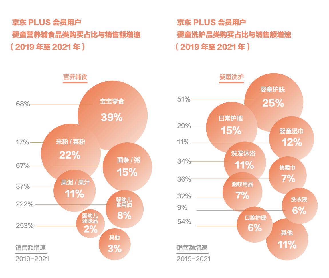 比如,在雙方參與上,以孩子為驅動力的家庭消費在關聯羣體中表現強勁,育兒場景這一剛需再度擴容。京東Plus會員的消費數據顯示,都市新手爸媽和鄉鎮樂活小家在母嬰類目的支出增速分別為33%和38%,國際品牌的嬰兒用品佔所有購買的40%以上,營養輔食類產品增速達到43%。兩者在育兒上都愈發精細化。