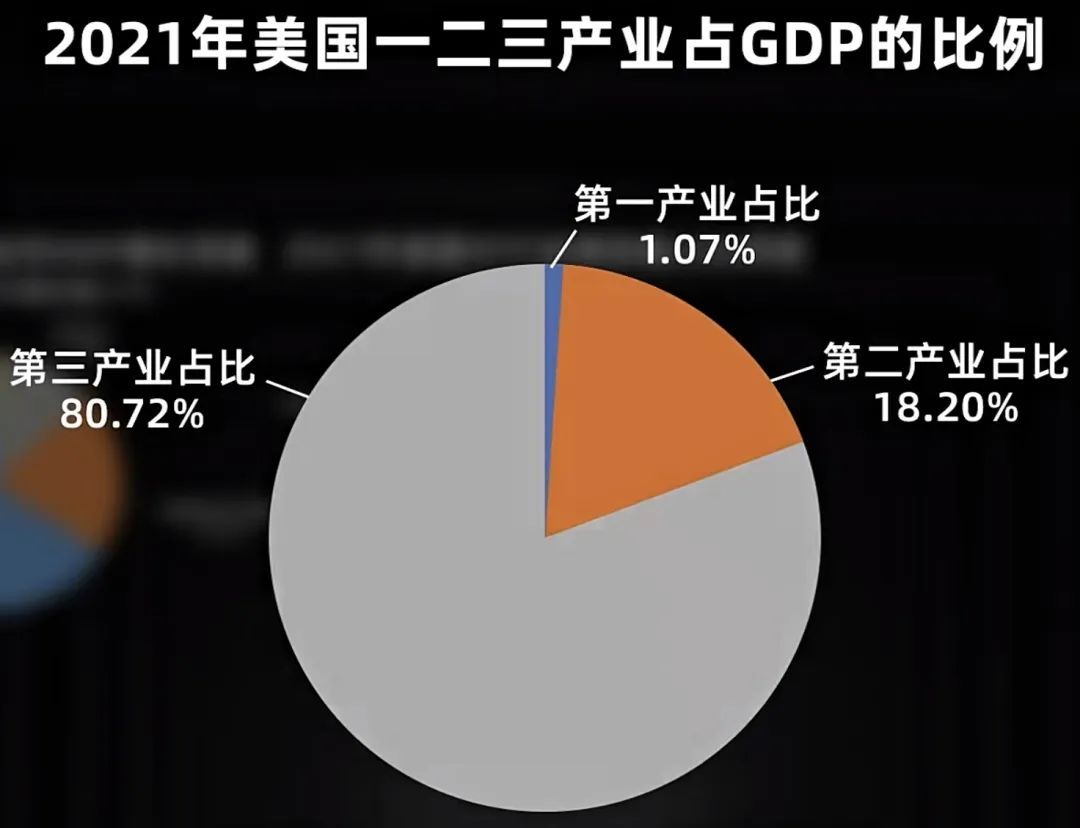 美國會誕生元宇宙、web 3,是因為國民經濟中工業大部分已經轉移到了全球,第二產業佔比已經低到18%了。所以,其結構決定了一直在虛擬經濟上做文章,因為能用到新科技的更多是娛樂、通信和金融行業等,佔比81%的第三產業。