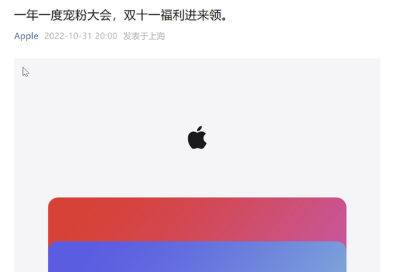 昨日晚間,蘋果官方微信在推文中介紹了雙 11 優惠: