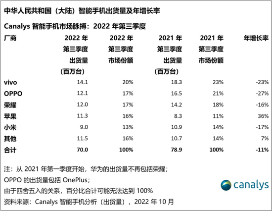 而據 Canalys 最新的報告,第三季度中國大陸智能手機市場出貨 7000 萬台,同比下跌 11%,小米、OPPO、vivo、榮耀都在雙位數下跌,前五隻有蘋果逆勢增長了 36%。