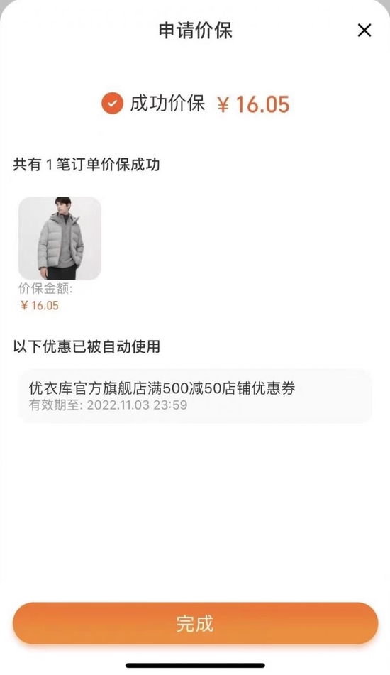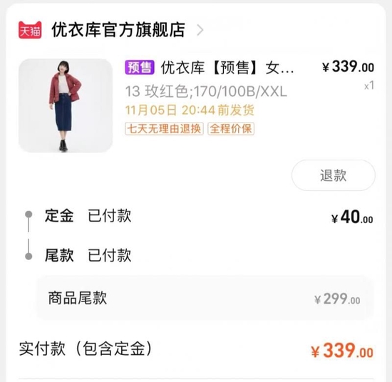 北青報記者發現,擁有類似經歷的消費者並不在少數。有消費者表示,自己在天貓「優衣庫官方旗艦店」買了一款男裝羽絨服,預售定金80元,尾款750元,其中優惠券減掉了33.95元,自己實付款764.71元。誰知,雙11商品一正式開售,商家又出一個滿500減50的優惠券,這樣算下來又比自己原先購買的便宜16.05元。另一位消費者同樣在該店鋪購買了一款女士羽絨服,定金40元,尾款299元,實付款339元,結果最終商品開售后店鋪又上線30元優惠券,這件衣服僅309就可以購買了,差價30元。