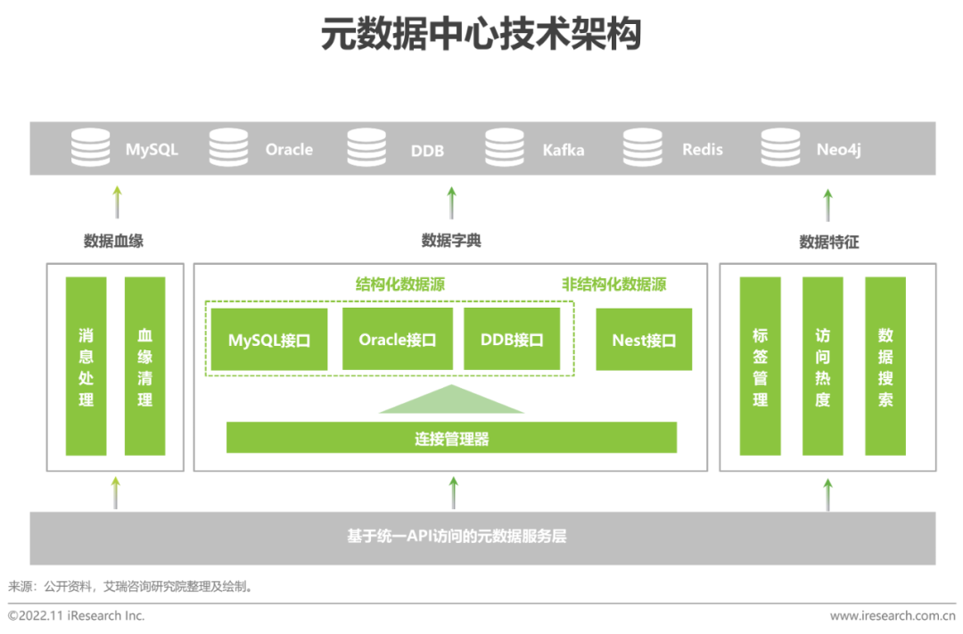 元數據管理用於確保全局指標的業務口徑一致,主要包含數據字典(描述數據的結構信息)、數據血緣(用於影響分析和故障溯源)以及數據特徵(描述數據的屬性信息)。常用產品分為:1)開源產品Metacat(擅長管理數據字典)和Atlas(擅長管理數據血緣);2)商業產品Cloudera Navigator。元數據中心對外統一提供API訪問接口,數據傳輸、數據地圖、數據服務等其他的子系統都可以通過API接口獲取元數據。