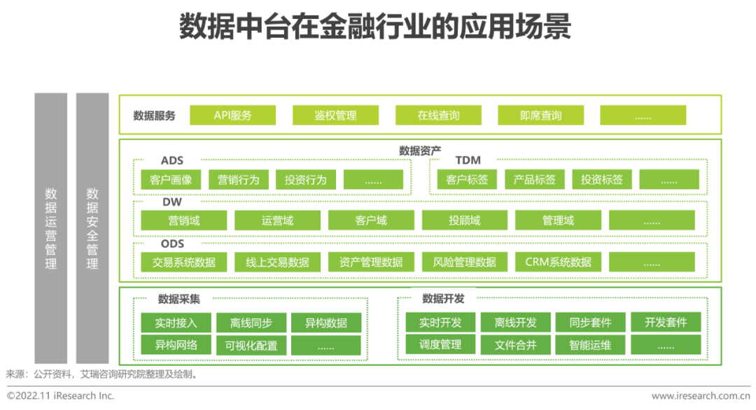 數據化轉型領先的金融機構已經開始搭建數據中臺,併產生很多優秀案例。數據中臺採集和整合金融機構內多個數據庫數據,建立跨越式數據模型,打破數據壁壘,統一加工、處理、輸出標準數據,建立數據資產,減少業務數據重複建設,徹底改變金融行業數據交付模式,形成專業的用户畫像,精準營銷,輔助運營決策,提升客户運營效率。