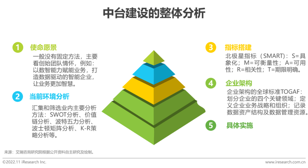 中臺項目實施難點,在於企業數字化過程中,虛實結合不到位。傳統諮詢常採用Top-Down打法,但往往是Top(規劃)有了,Down(落地)困難,常被稱為「缺腿和腳」。純技術出身的中臺廠商則需補充Top-Down 的方法論。目前,大多中臺廠商在為企業提供服務時,多采用從規劃到組織再到工具的自上而下打法,這其中要麼自建諮詢團隊,要麼生態合作完成。企業首先要明確自己的使命、願景(To-Be)和當前狀況(As-Is),然后確定企業接下來一段時間的北極星指標,然后將該指標拆分為子指標,然后確定數據管理和應用體系,最后纔是中臺具體路線。一開始這些看上去較「虛」的動作,其實是中臺能堅定、持續走下去必不可少的要素。這種方式,其實可以看成是「金字塔原理」以及「OKR」在數字化轉型中的具體應用。所以,企業中臺建設不僅是技術問題,更是管理問題,是企業的一把手工程。