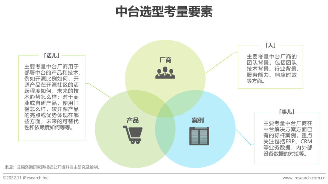 企業在中臺選型時,應從人、活兒、事兒三方面進行考量。「人」是指:企業應該考慮中臺廠商的團隊背景,如是否有大數據背景,是否有行業背景。「活兒」是指:目前中臺廠商的產品中,哪些是開源的,哪些是自研的;如果是開源的,是否是主流且代表未來趨勢的技術路線;如果是自研的,核心優勢在哪,與開源產品的語法、體驗等是否一致,會不會為自己帶來相應IT人才的缺乏;各個模塊之間是松耦合還是緊耦合;產品的使用門檻是否較低,體驗是否良好。「事兒」是指:中臺廠商在歷史上,是否有本行業的成功案例,取得了哪些顯著成果;中臺廠商與本企業的其他系統(如ERP、CRM等)是否有成功的對接先例,從而在實施中可以提高效率並降低風險。