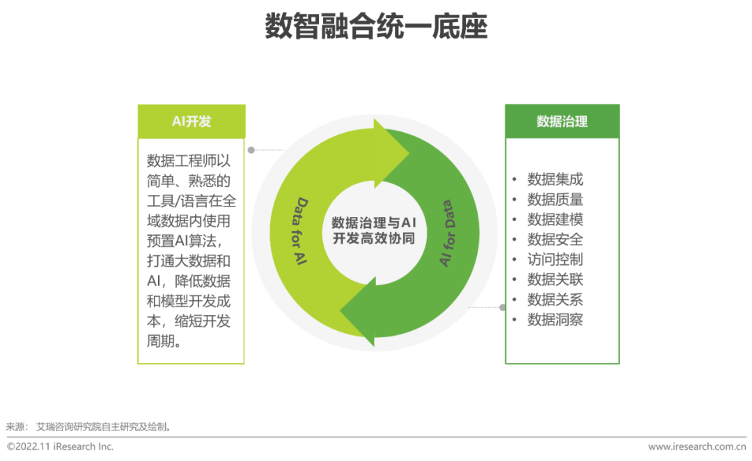 所謂數智融合,即構築數據治理和AI開發的統一底座,讓數據和人工智能相互作用。一方面, Data for AI :通過對元數據統一管理,解決傳統數據分析與AI模型之間的「數據搬家」問題,打通數據分析與AI模型引擎,實現基於一份數據多模分析,提升數據驅動決策的準確性和可信性,讓數據工程師靈活進行模型和特徵訓練,實現數據與AI開發高效無縫互通。另一方面,通過AI for Data :將人工智能算法模型的能力植入到數據治理,通過機器學習自動發現數據管理的規則,在數據模型管理、元數據管理、主數據管理、數據安全等多場景中廣泛應用。因此,人工智能對於提升數據治理的智能化水平具有關鍵作用,也是降低數據治理門檻的重要突破方向。