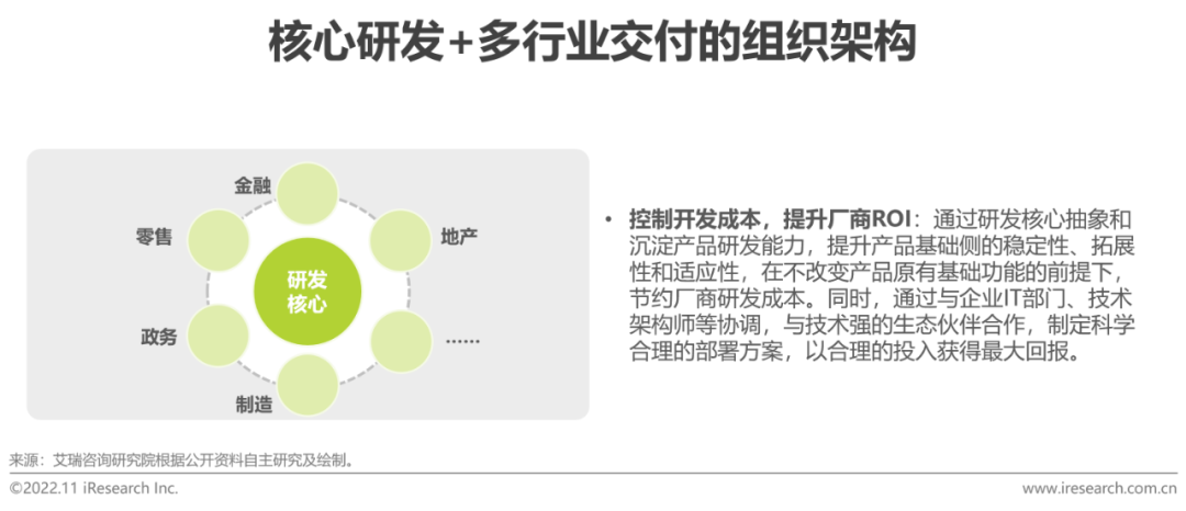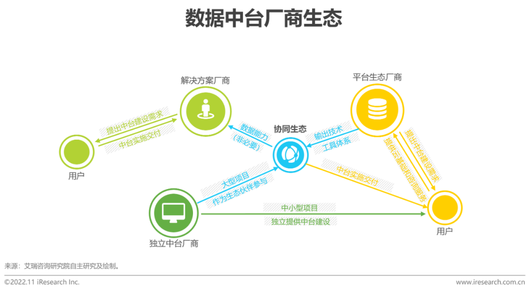 廠商發展邏輯正從競爭轉向競合,以協同生態為核心,集眾所長,合力拓展協同應用解決方案的廣度和深度。平臺生態廠商擁有內部率先落地中臺戰略,之后對外提供服務的先發優勢,為行業發展輸出方法論、技術和工具體系,商業模式以「提供雲基礎服務,生態夥伴實施交付」為主。解決方案廠商積累了豐富的垂直行業服務經驗和客户服務基礎,可快速準確洞悉企業業務流程和痛點需求,但項目實施交付一般需要外部提供數據能力支持。獨立中臺廠商核心技術團隊普遍來自行業頭部廠商,技術背景紮實,行業經驗過硬,但品牌影響力相比平臺生態廠商較弱。