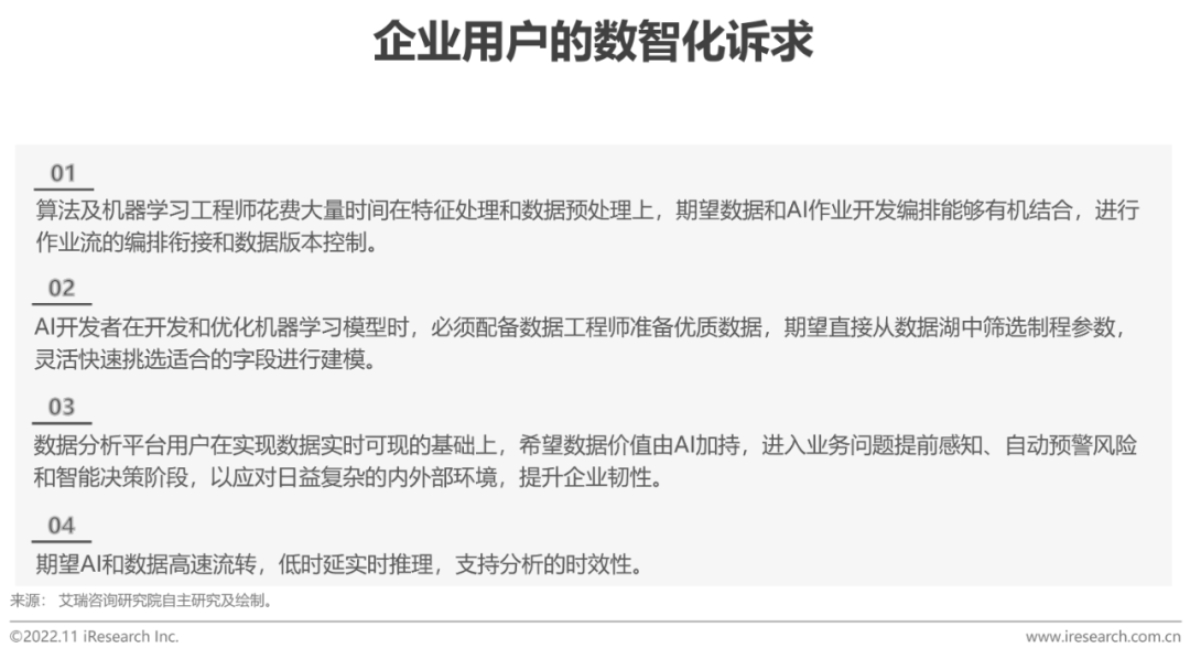 雲原生是當下最為確定的技術趨勢,存算分離、微服務、ServerLess等核心技術要素驅動數據中臺走向雲原生。數智融合理念將AI算法模型植入數據治理,高質量數據反哺AI開發能力,讓數據和AI開發高效互通。泛中臺化趨勢明顯,業務場景需求的解決方案/產品趨於「中臺化」,以數據中臺為基礎的中臺體系不斷豐富。