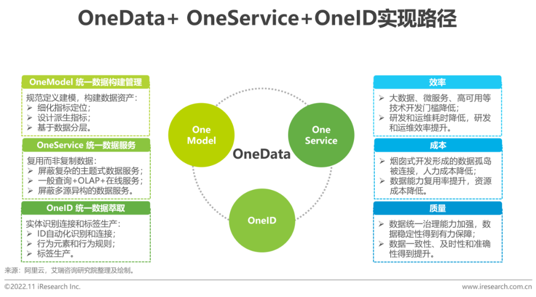 頭部的平臺生態廠商在內部落地中臺戰略,獲得檢驗后對外輸出成熟的中臺建設核心方法論:OneData+OneService+OneID。OneData的本質是構建從算法定義、數據研發到數據服務的統一指標和算法,數據採集、匯聚、清洗、加工、調動一次完成,避免因不同的業務場景造成不同部門對數據的重複建設,讓數據成為可複用、可深挖價值的資產,而非拖垮業務推進的隱性成本。OneService的本質是數據即服務。傳統數倉從不同的系統調用數據時受數據庫權限限制,需要開發人員定製不同的訪問接口,出錯時還難以追溯影響到哪些應用和報表。數據中臺通過平臺化的工具/接口,一方面為應用開發屏蔽了底層數據存儲,提供數據查詢統一接口,另一方面提高了數據應用的管理效率,建立了從報表到應用的清晰鏈路,提升數據開發的友好性。