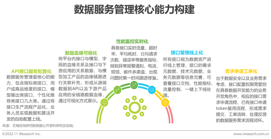 數據服務是數據中臺的能力出口,是數據應用的重要支撐。企業通過中臺能力封裝關鍵數據實體,將數據採集、數據傳輸、數據存儲、數據處理、數據交換等數據的各種形態轉化為可高效複用的軟件服務。數據中臺提供的數據服務可大致分為三類:1)主題式數據服務。基於元數據規範定義和建模,構建主題邏輯表,屏蔽複雜物理表,提供業務視角下的查詢;2)統一且多樣化數據服務。一站式提供一般查詢、OLAP 分析、在線接口服務等查詢和應用服務,便於數據跟蹤管理;3)跨源數據服務。統一數據接入層,屏蔽多種異構數據源的讀寫差異,減少數據訪問和應用成本。數據服務通過平臺化、配置化的方式,快速生成API服務,減少定製化開發對不同工種的依賴,同時屏蔽底層數據的技術細節,讓數據消費者無需關心數據的源頭問題,實現「數據即服務」。從實施路徑來看,構建數據服務模塊應具備以下五大核心能力,才能擔起數據與應用之間的「橋樑」角色: