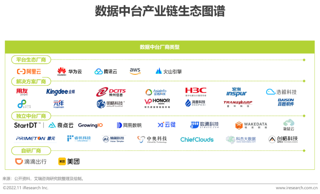 當前數據中臺的行業集中度仍保持較低水平,行業的活躍參與者大致分為平臺生態廠商、解決方案廠商和獨立中臺廠商三類,行業格局由競爭轉向競合,以協同生態為核心,集眾所長,將成熟的技術方案與行業服務經驗結合,協同拓展應用解決方案的廣度和深度,深耕於金融、泛零售、政務、製造、工業等多行業應用場景。