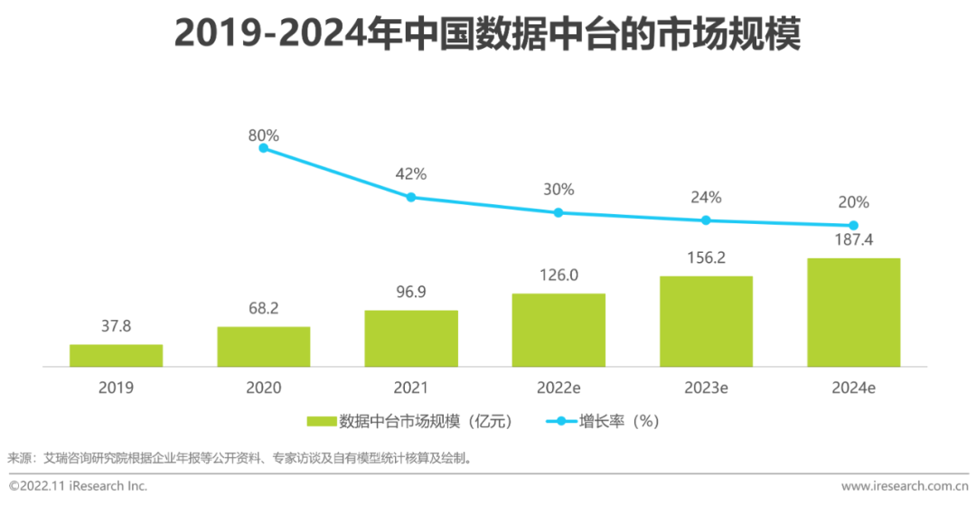 2021年數據中臺市場規模達到96.9億元。在供給側,行業的生態化合作趨勢明顯;在需求側,企業對數據中臺的關注點從中臺本身轉向了最終的數據變現能力。行業集中度和成熟度持續上升,整體規模穩步增長,增速趨於平穩,預計將在2024年達到187.4億元。