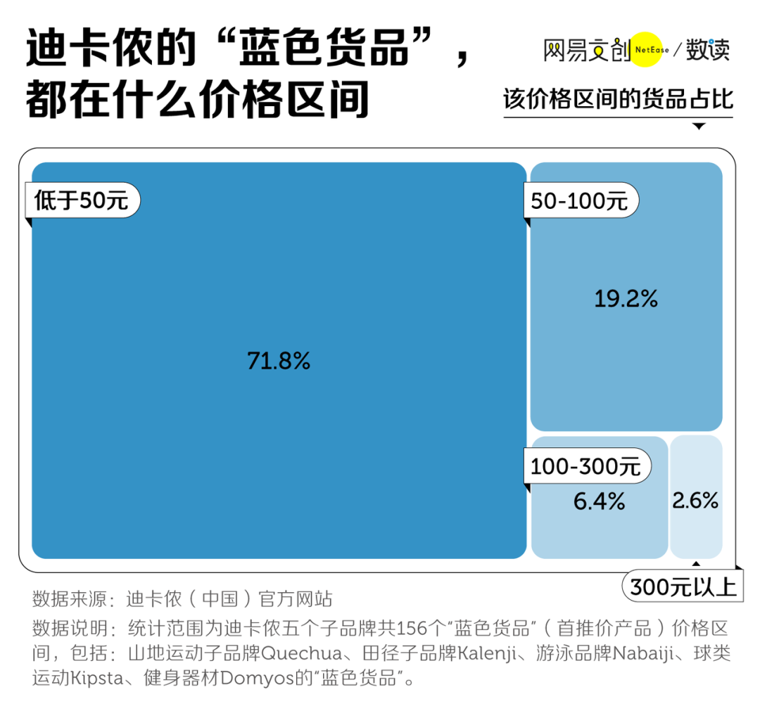 這些藍色貨品,就是迪卡儂每個系列最划算、最暢銷的產品。我們抽樣了迪卡儂的五個子品牌的「藍色貨品」,超七成的產品價格都低於 50 元。