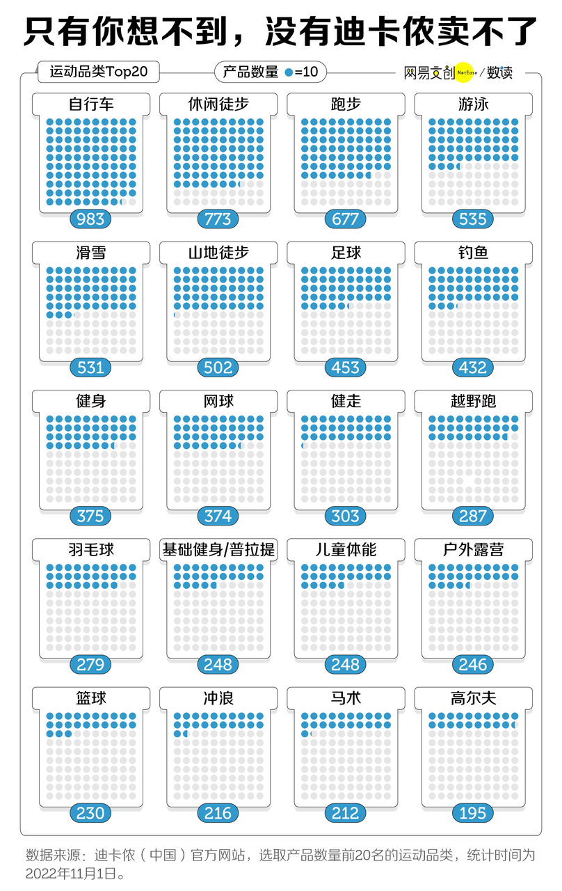 2021 年,迪卡儂在全球共有 1747 家門店 [1],相較其他品牌或許顯得不夠多,但架不住它面積大,一個能頂仨。