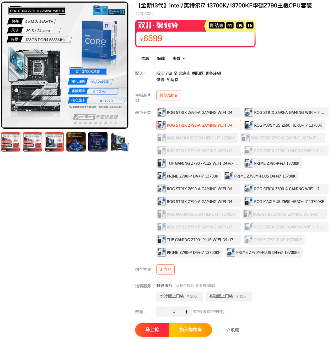 且天貓商城還有華碩Z790吹雪D4主板搭i7-13700K處理器套包,雙十一活動價6599元。