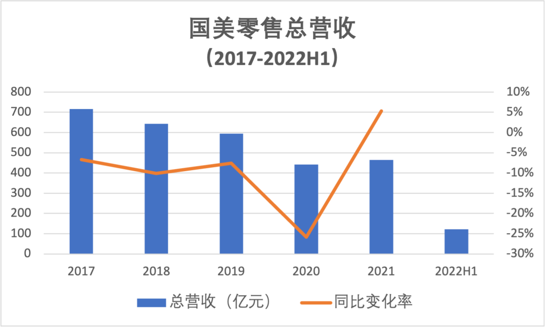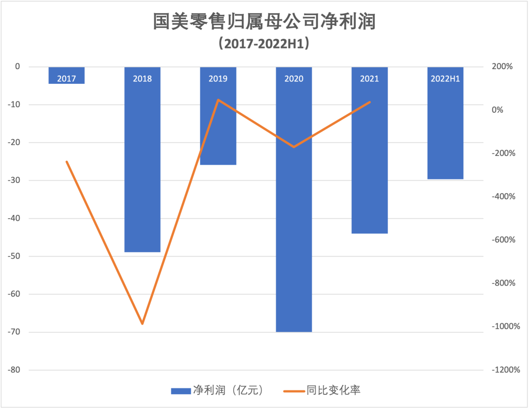 2017年至2021年這五年,國美的營收逐年下滑,從715.75億元下降至464.84億元;五年間國美沒有一年盈利,虧損從4.5億元擴大至44.02億元,累計虧損超過220億元。2022年上半年的業績也極不樂觀,營收僅為121.09億元,同比下降53.5%,淨虧損29.66億元,同比下滑250.24%。