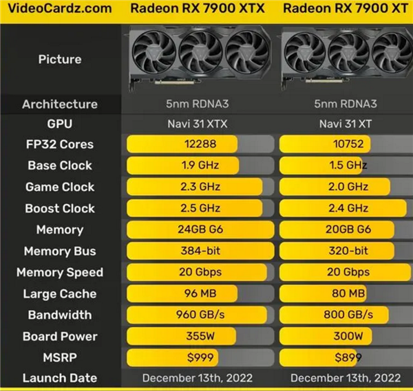 本次發佈的型號分別是RX 7900XT和RX 7900XTX,其中RX 7900XTX採用滿血版Navi 31 XTX核心,擁有12288個流處理器,而RX 7900則是Navi 31 XT核心,擁有10752個流處理器。