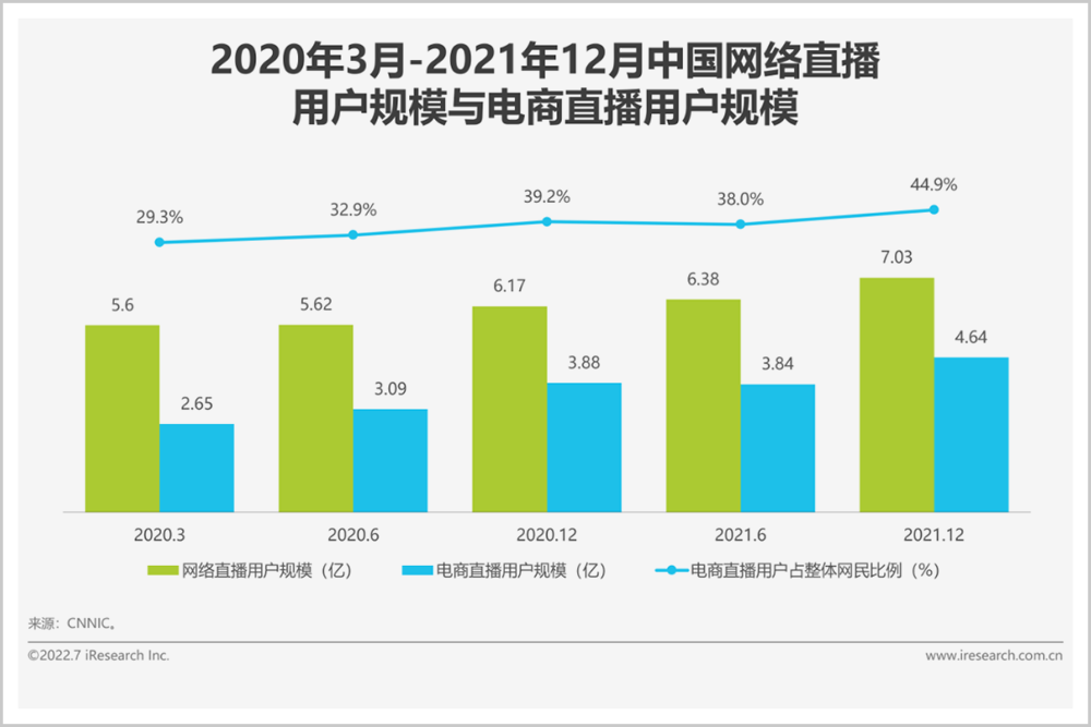 中國互聯網絡信息中心第49次統計結果更容易看出關鍵。據其顯示,截至2021年12月,我國直播電商用户已突破4.64億,佔網民整體的44.9%。