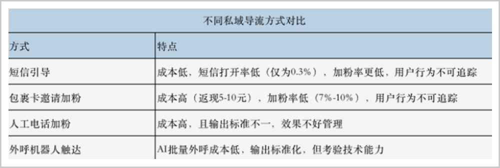 個人信息隱私保護的不斷強化,意味着以往「暴力加粉、粗放獲客」的方式,再也沒有用武之地了。短信引導、人工電話加粉、外呼機器人觸達這三大私域導流方式基本已經退出舞臺。僅存的包裹卡邀請加粉方式的前景很難説,未來國內電商是否會仿效亞馬遜,打擊快遞內的小卡片,也未可知。