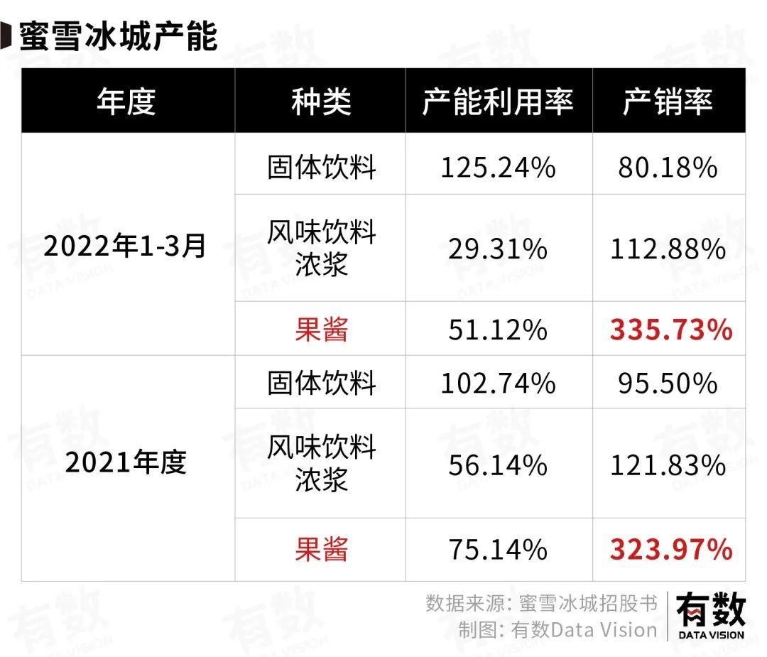 具體來看,則是蜜雪冰城對中上游的不斷深入。在中游的食材生產環節,蜜雪冰城營收貢獻最高的三種食材里,只有固體飲料全部自主生產。風味飲料濃漿和果醬的產銷率常年大於100%。