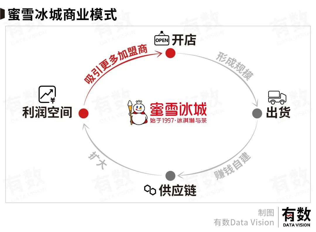 如上圖所示,蜜雪冰城這套加盟模式的成功是建立在這個有效的正循環之上的,而在這其中,最為關鍵的,則是如何用切實更高的利潤,去吸引更多加盟商開店這一環。