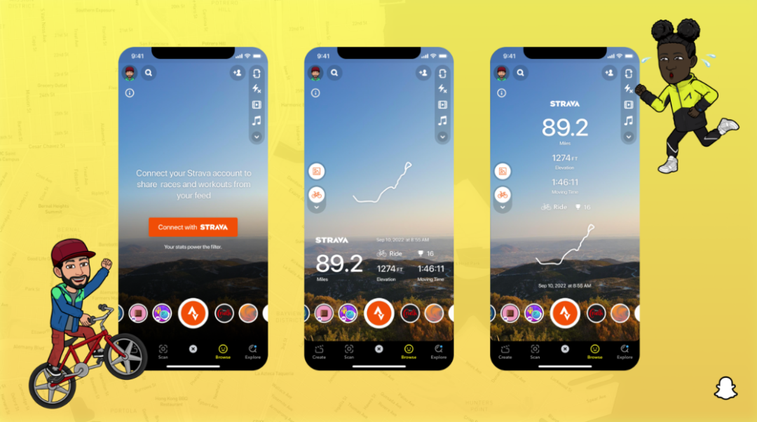 其工作原理是,Strava Activity Lens在Snapchat的相機顯示屏上,提供 AR 疊加選項,使用來自 Strava 的數據,以便用户在Snap Map上分享他們最近的鍛鍊,以顯示鍛鍊路線、距離、步速或其他數據點。