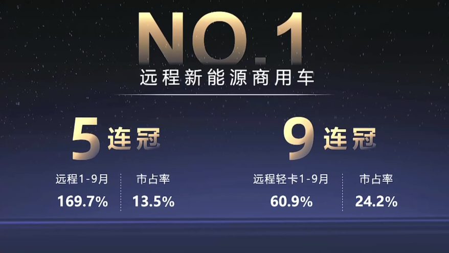 今年1-9月,遠程新能源商用車同比增長169.7%,其中遠程新能源輕卡1-9月市佔率達24.2%,總體銷量排名行業第一,在覈心產品新能源物流車方面,遠程1-9月實現同比增長259%,市佔率為19.58%。