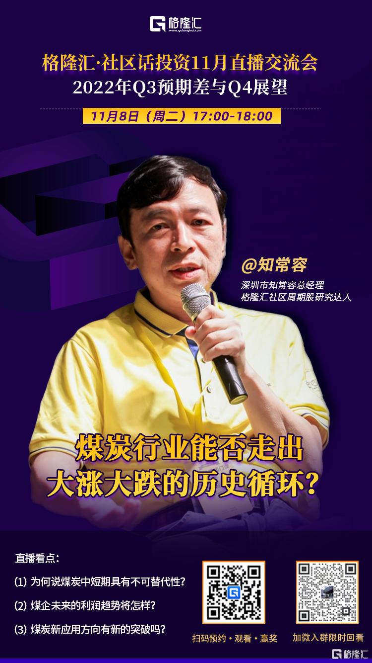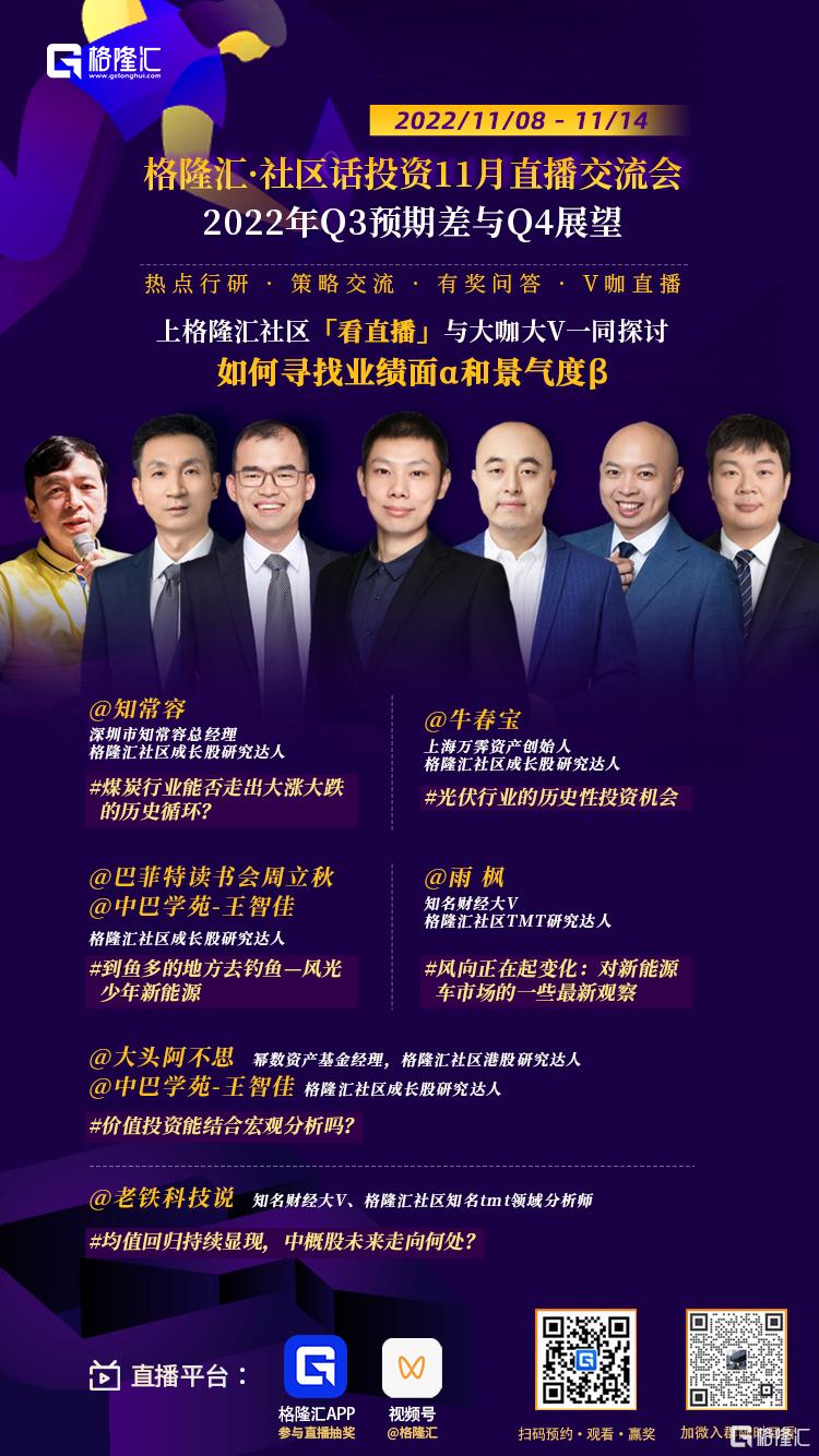 在目前這種結構化行情下,每一輪反攻,無論是反彈還是反轉,找對強景氣度β賽道和優業績α的個股才能避免踏空或者跑輸指數。爲了更深入的從中觀角度瞭解目前一些行業及板塊的基本面和景氣度差異,更精準有效的抓住強賽道的有關投資機會,格隆匯社區特聯合眾多知名財經大V和機構投資大咖於11月08日-11月14日推出格隆匯社區話投資·11月直播交流會——《2022年Q3預期差與Q4展望》,共7位重磅嘉賓將從各自專注的投研領域,結合行業基本面、市場熱點和產業邏輯,分別就煤炭、光伏、風電、新能源車、航運,汽車銷售,鄉村振興、中概股等有關市場關注賽道及行業板塊作直播分享。