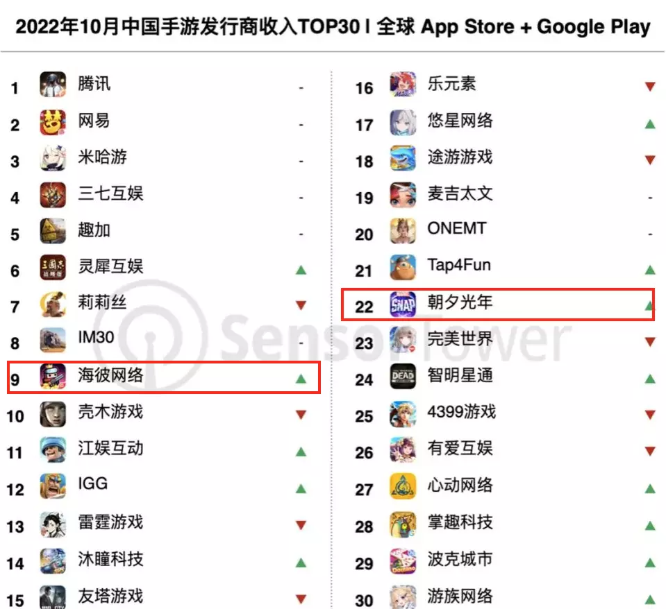 與海彼網絡情況類似,得益於新遊《MARVEL SNAP》(漫威:瞬戰超能)的推出。10月朝夕光年收入環比提升43%,在中國手遊發行商收入排行榜的排名前進7位至第22名。
