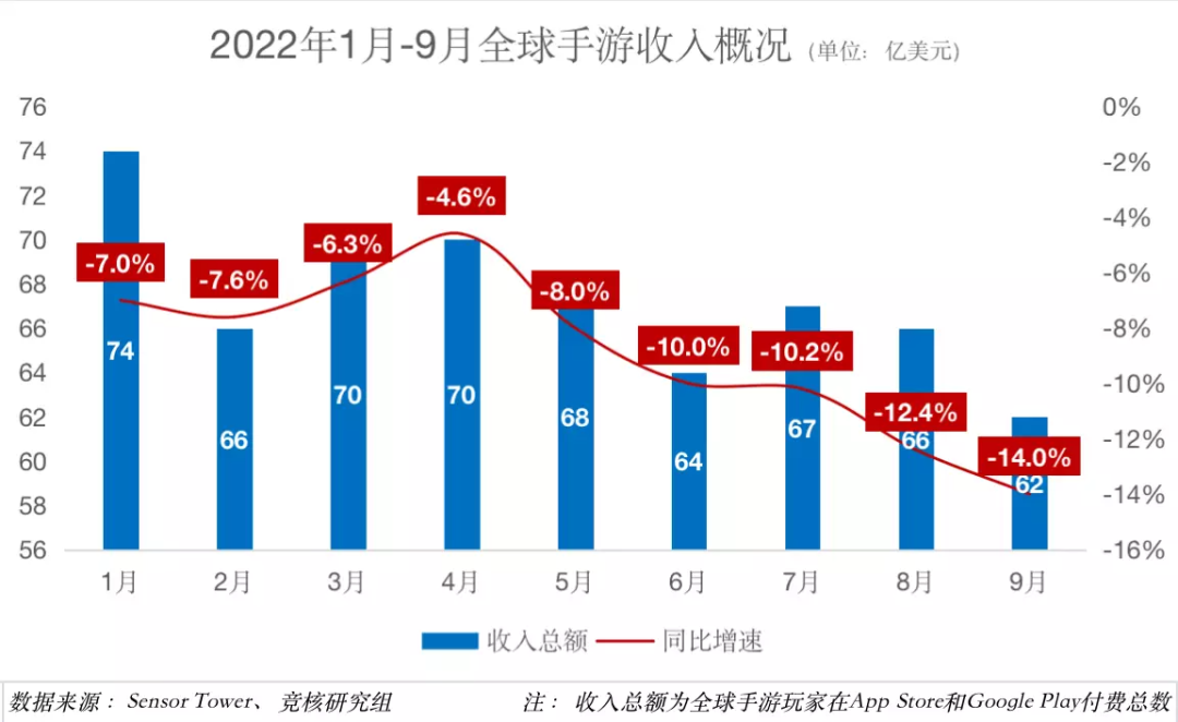 2022年1月-9月,全球手遊玩家在App Store和Google Play消費金額分別為:74億美元、66億美元、70億美元、70億美元、68億美元、64億美元、67億美元、66億美元、62億美元。