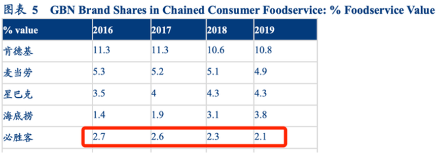 據歐睿統計的GBN(Global Brand Name)榜單,以連鎖餐廳的終端銷售額統計,2016年-2019年必勝客的市場份額逐年減少。