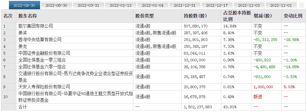 值得注意的是,多家機構在三季度對歌爾股份進行了減持,其中,香港中央結算有限公司和全國社保基金六零一組合減持力度最大,分別為19.58%、14.68%,此外,易方達競爭優勢企業和全國社保一零三組合也進行了小幅減持,分別減持了92.16、40.0922萬股。中證金融三季度持倉保持不變,險資天安人壽加倉100萬股,華夏中證5G則新進前十大股東。