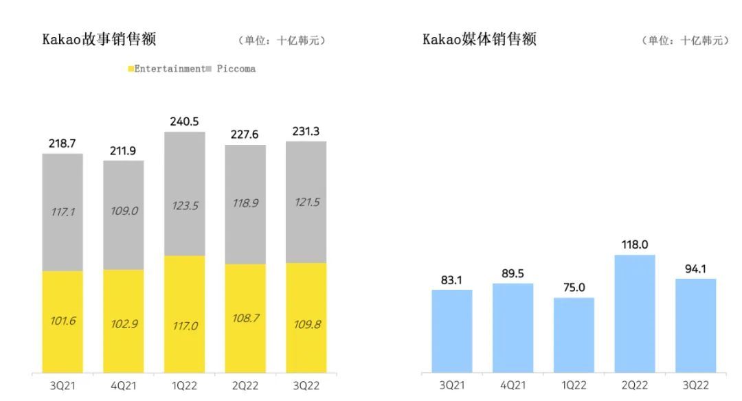 包括Piccoma、Kakao Page、Kakao Webtoon等在內的故事版塊銷售額為2312億韓元(12億元),同比增長6%。其中Piccoma銷售額為1215億韓元(6.4億元),同比增長4%,kakao Entertainmen銷售額則為1098億韓元,同比增長8%。