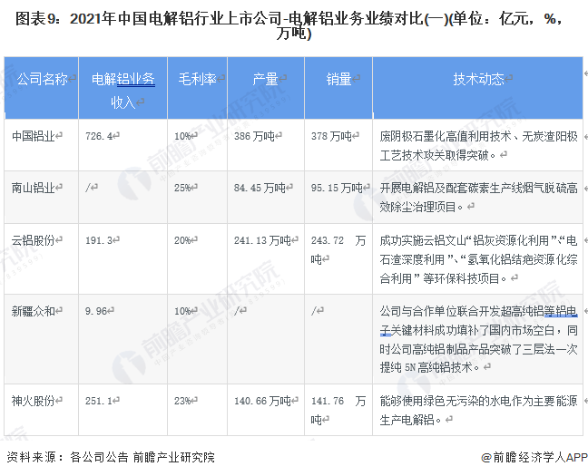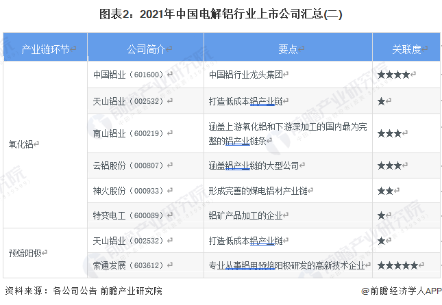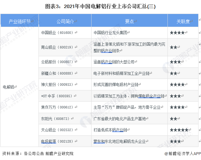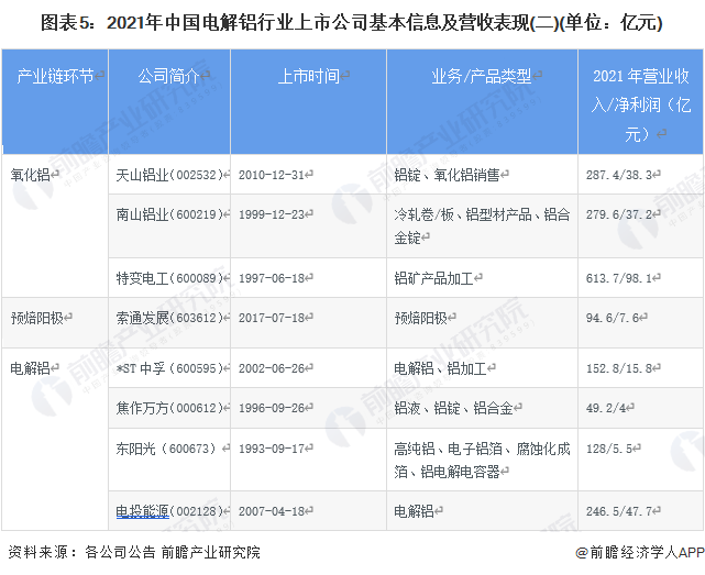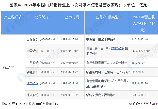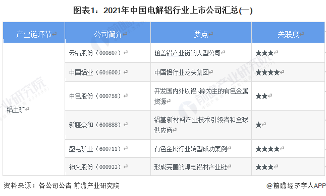 電解鋁行業主要上市公司:中國鋁業(601600)、南山鋁業(600219)、雲鋁股份(000807)、新疆眾和(600888)、神火股份(000933)、*ST中孚(600595)、焦作萬方(000612)、東陽光(600673)、天山鋁業(002532)等