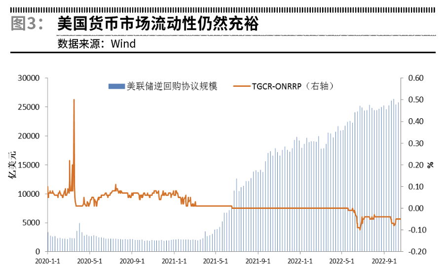 不同於此前幾次突發風險事件對國債市場流動性的瞬時衝擊,本輪加息周期帶來的流動性緊縮效應是緩慢累積的。從貨幣市場角度來看,當前美元流動性仍然相對充足。目前三方一般擔保利率(TGCR)與和隔夜逆回購利率(ON RRP)的利差仍然處於低位,表明一級交易商的融資難度較低。美聯儲資產負債表中逆回購工具的使用規模從2021年3月的不到10億美元持續攀升至目前的2.58萬億美元,表明貨幣市場流動性充裕。此外,美聯儲於2021年7月設立了常備回購流動性便利工具(Standing Repurchase Agreement Facility,SRF),以防止市場流動性短缺,但目前尚未投入使用。
