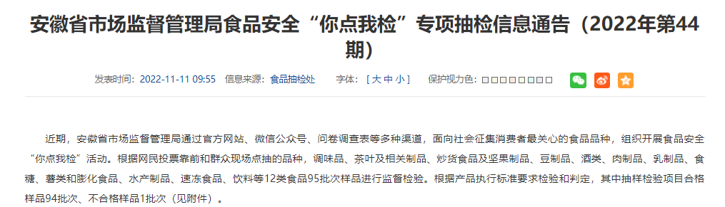 中國質量新聞網訊 2022年11月11日,安徽省市場監督管理局網站發佈食品安全「你點我檢」專項抽檢信息通告(2022年第44期)。