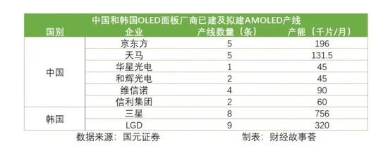 在產線代際層面,目前中國的面板企業有19條已經建立的AMOLED產線,總產能538千片/月;而韓國企業,共有17條產線,總產能卻達到1076千片/月。同時,國內的AMOLED產線,最高的是6代生產線,而韓國卻已經達到了10.5代際,兩國的面板企業產線仍有一定的差距。