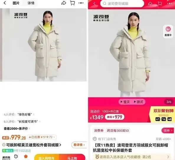 此次股價登上熱搜前,波司登纔剛剛引起一波熱議。彼時,媒體報道稱,雙11期間有上海市民發現波司登旗艦店一件可脱卸帽莫蘭迪寬松外套羽絨服價格僅便宜0.28元。該市民透露,這件外套在9月份平臺的價格是券后979.28元,但沒想到在雙十一預售期間,該款羽絨服的價格提升至1349元,領券購買后實際價格仍為979元。