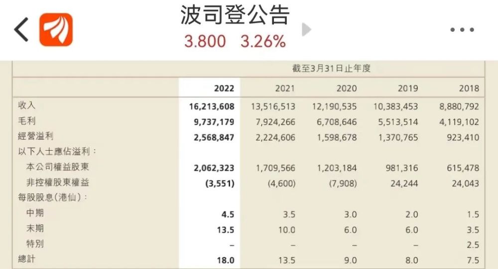 即使股價表現不理想,該公司業績卻仍在增長。2022年6月末,波司登在業績會上披露了2021/2022財年業績數據。截至2022年3月31日,波司登的營業總收入約162.14億元,同比增長20.0%;歸母淨利潤約20.62億元,同比增長20.6%。