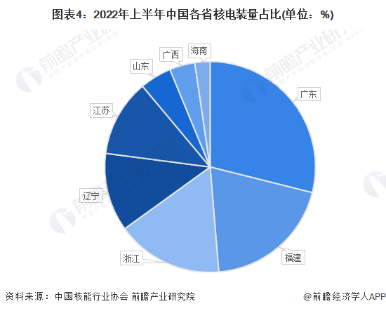 從核電站的區域分佈來看,目前我國所有在運核電站均分佈在沿海地區。其中,廣東省的裝機容量最大,其次是福建省,裝機容量均超過1萬Mwe,兩省裝機容量合計佔比接近50%。